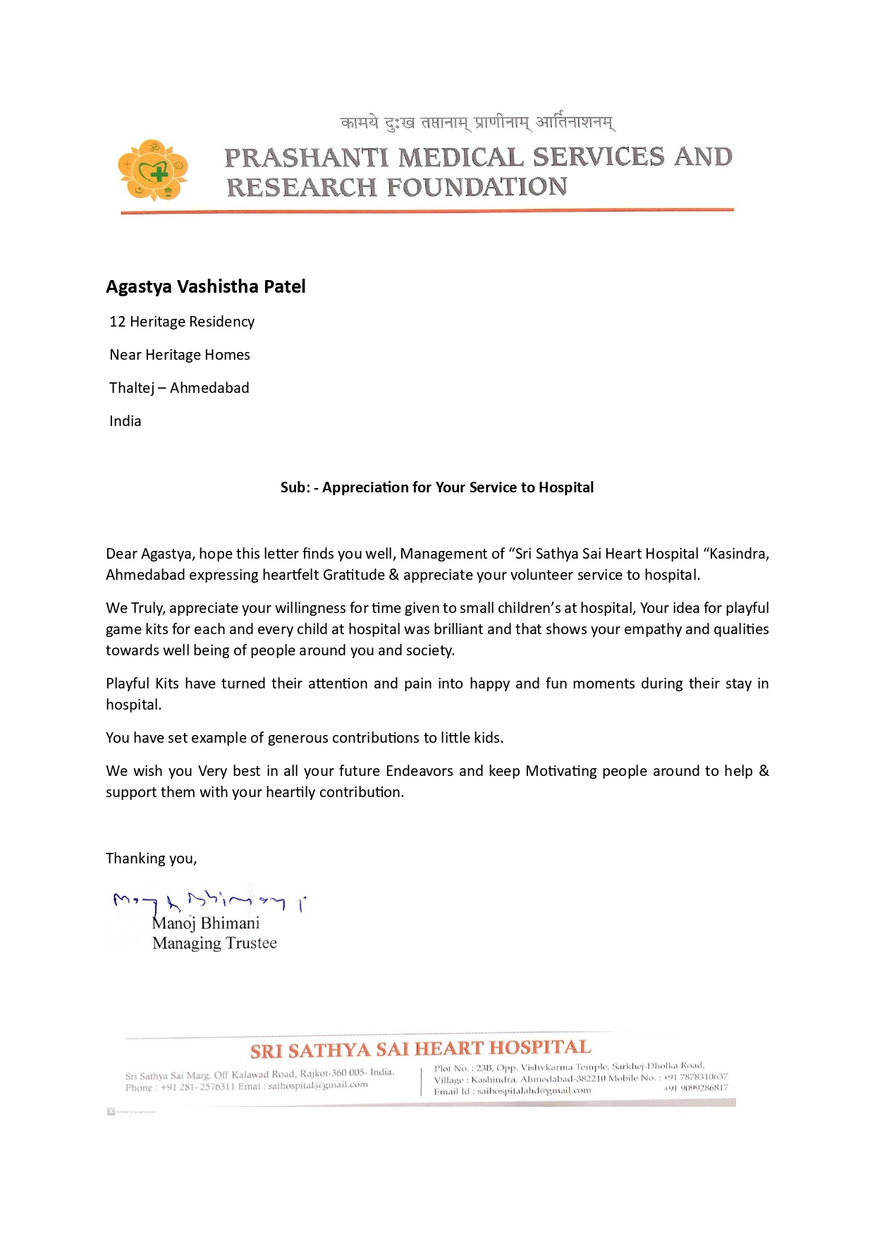 Visiting the hospitalized children at the Sathya Sai Hospital left a lasting impact on me as my heart wept at such young souls going through serious illnesses. Three years ago, I started bringing toys to brighten their days, and now I visit them regularly with small gifts. Seeing the happiness these small gestures bring to them is incredibly fulfilling.